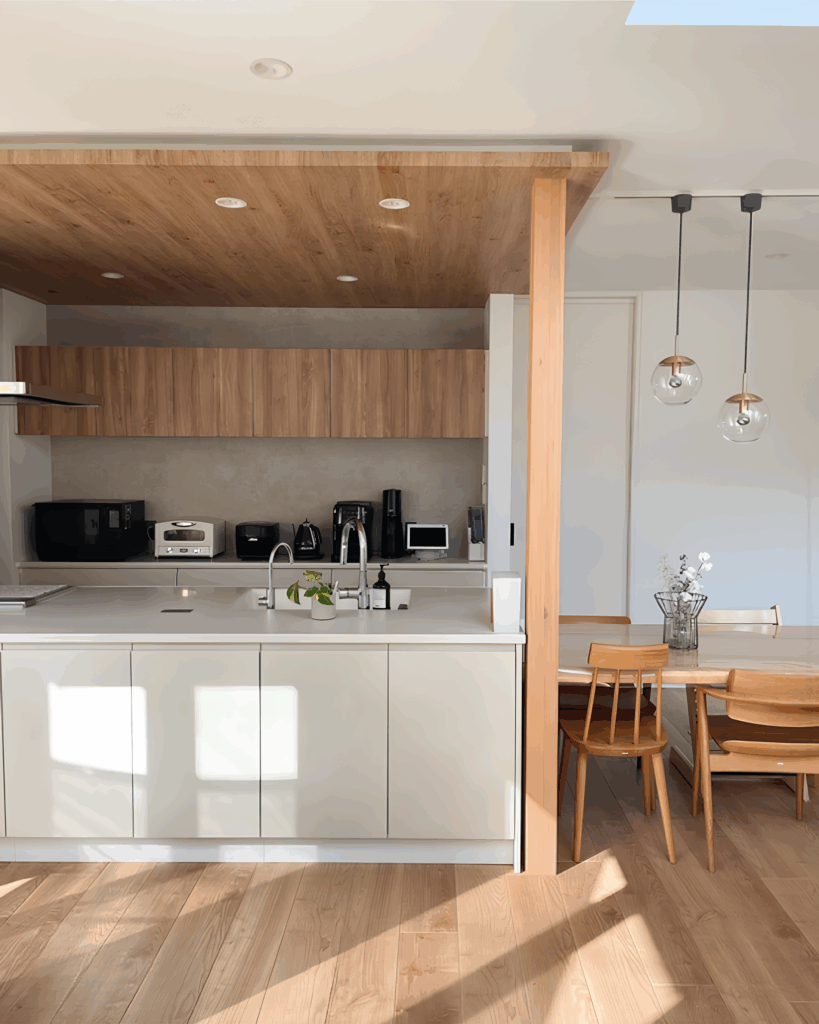 キッチン内は、白いカウンタートップと木のトーンがうまく調和して、落ち着いた空間に。特に、シンプルなデザインのシンクや、スタイリッシュなカップやボトルが置かれたカウンターが、機能的でありながら、デザインにもこだわっていることが伝わってきますね。