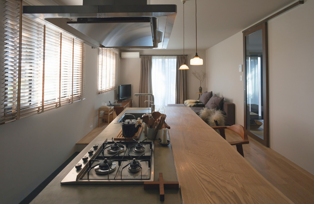 「どっしりした存在感」と「質感の美しさ」を大切に、キッチンが暮らしの中心になるような空間に仕立てました。