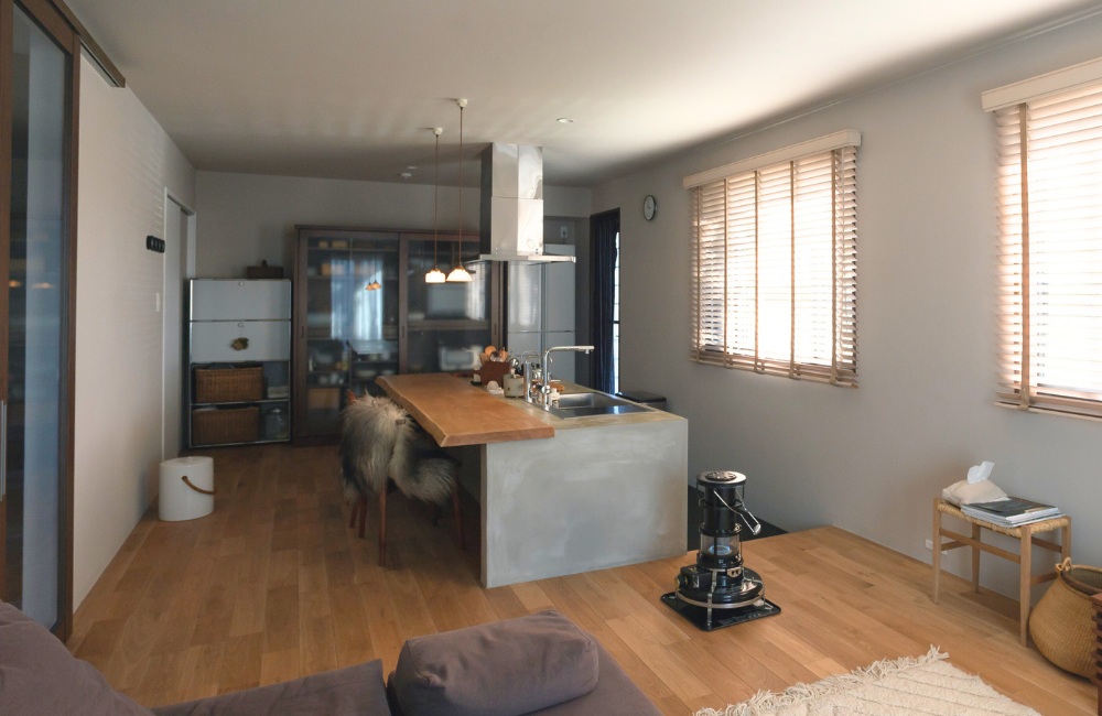 憧れだったコンクリート仕上げの造作キッチンや廊下、一枚板のカウンターテーブル、塗り壁のリビング・・・