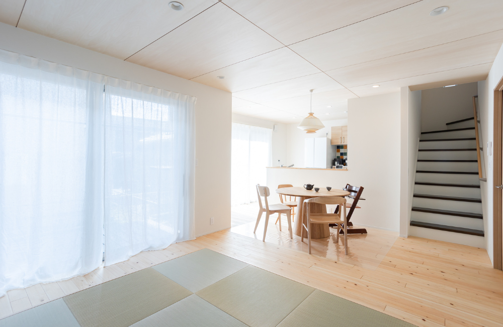 畳を取り入れたリビングや無垢材の床など、自然由来のやさしさを感じる素材をセレクトし、笑顔が似合うあたたかな空間に生まれ変わりました。