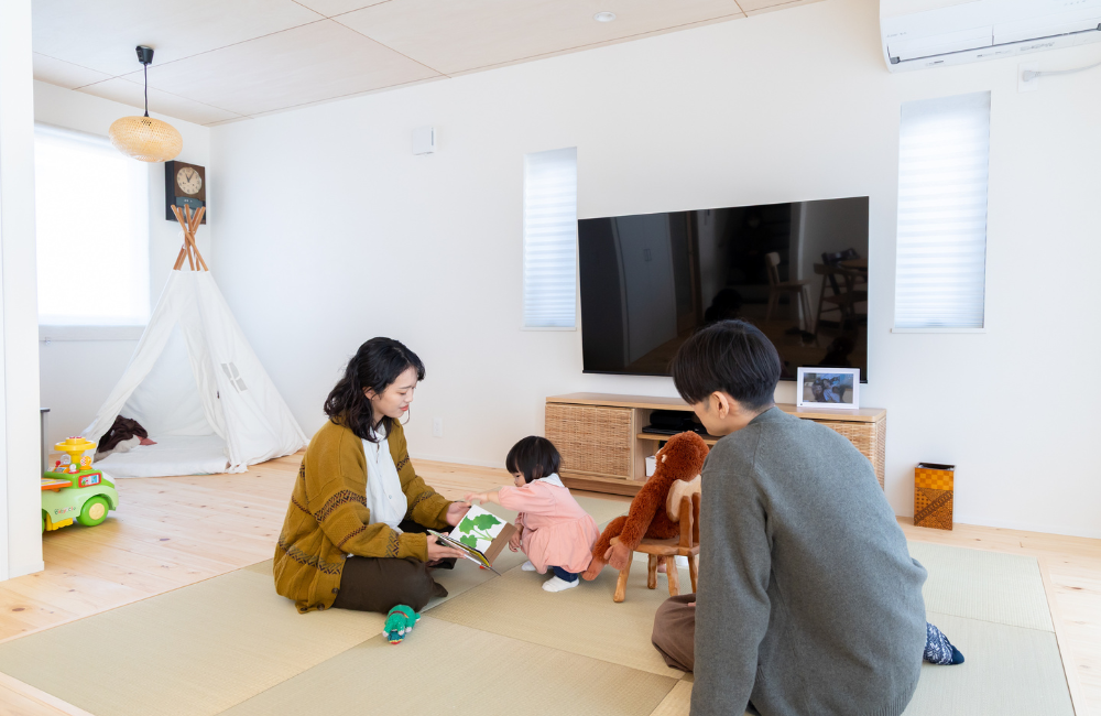 そのまま寝転んでゆっくり過ごせる畳リビングは、お子様ものびのびと安心して遊ぶことができますね。