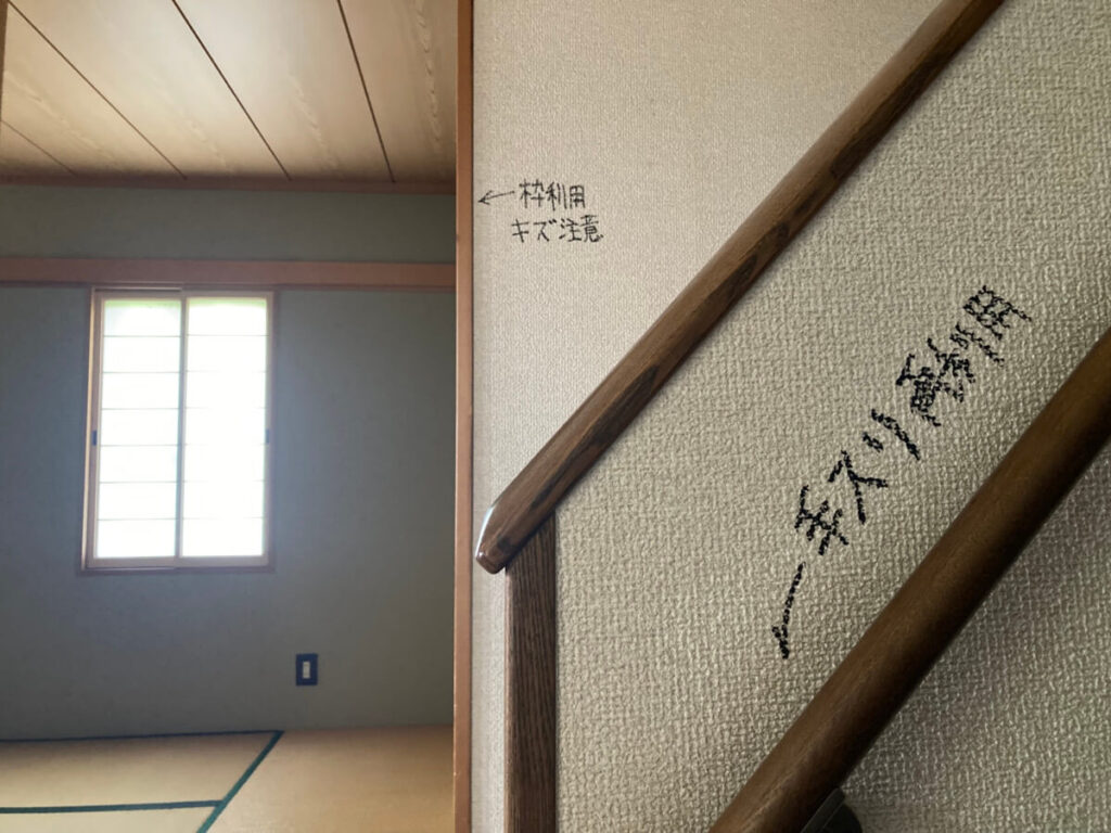 また、リノベーションでは、既存を活かす部分と解体する部分が複雑に入り組んでいるため、解体屋さんが一目で判断できるよう、現場には明確な印を付けて区別しています。