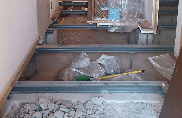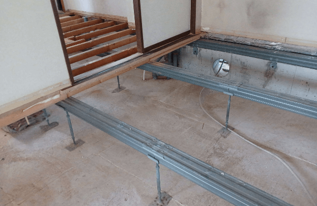 Y・Y様邸は築28年の大和(ダイワ)ハウスの建物です。 今回のリノベーションでは新たに断熱材を敷設するため既存の床材は撤去し、既存の鋼製束と鋼製大引のみになりました…