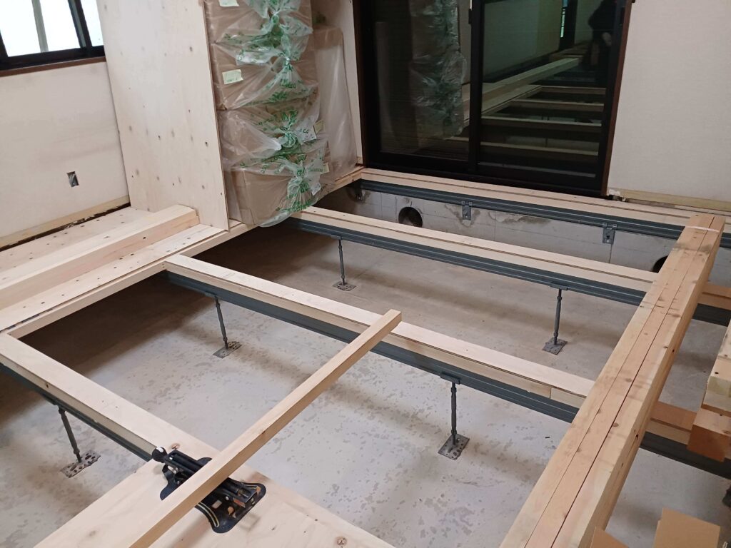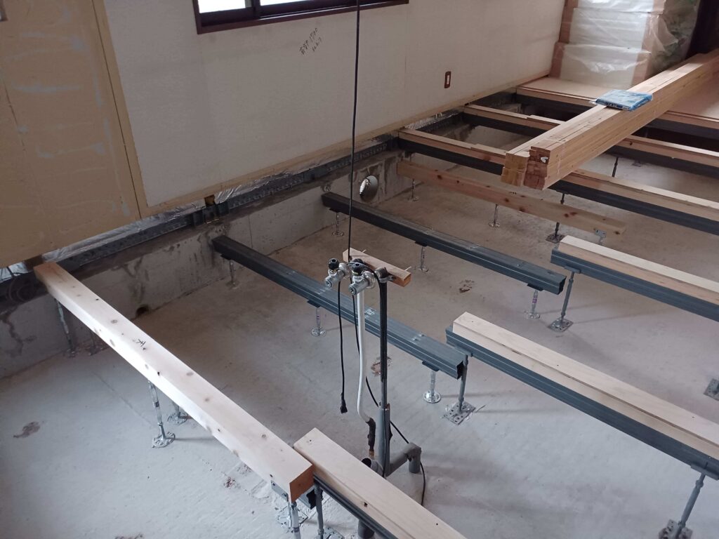 今回のリノベーションでは新たに断熱材を敷設するため既存の床材は撤去し、既存の鋼製束と鋼製大引のみになりました。