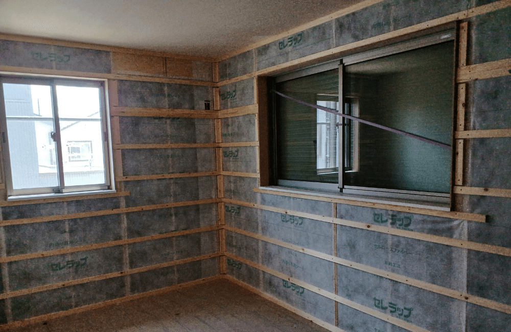 外壁と室内の間に空間を造り、そこに「セルロースファイバー」を吹き込みます。空間を造るために、専用シートを張った様子がこちら↓