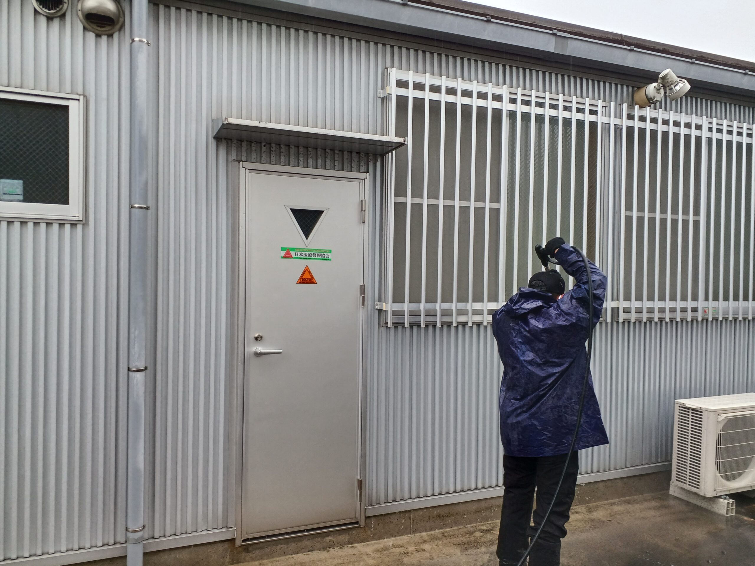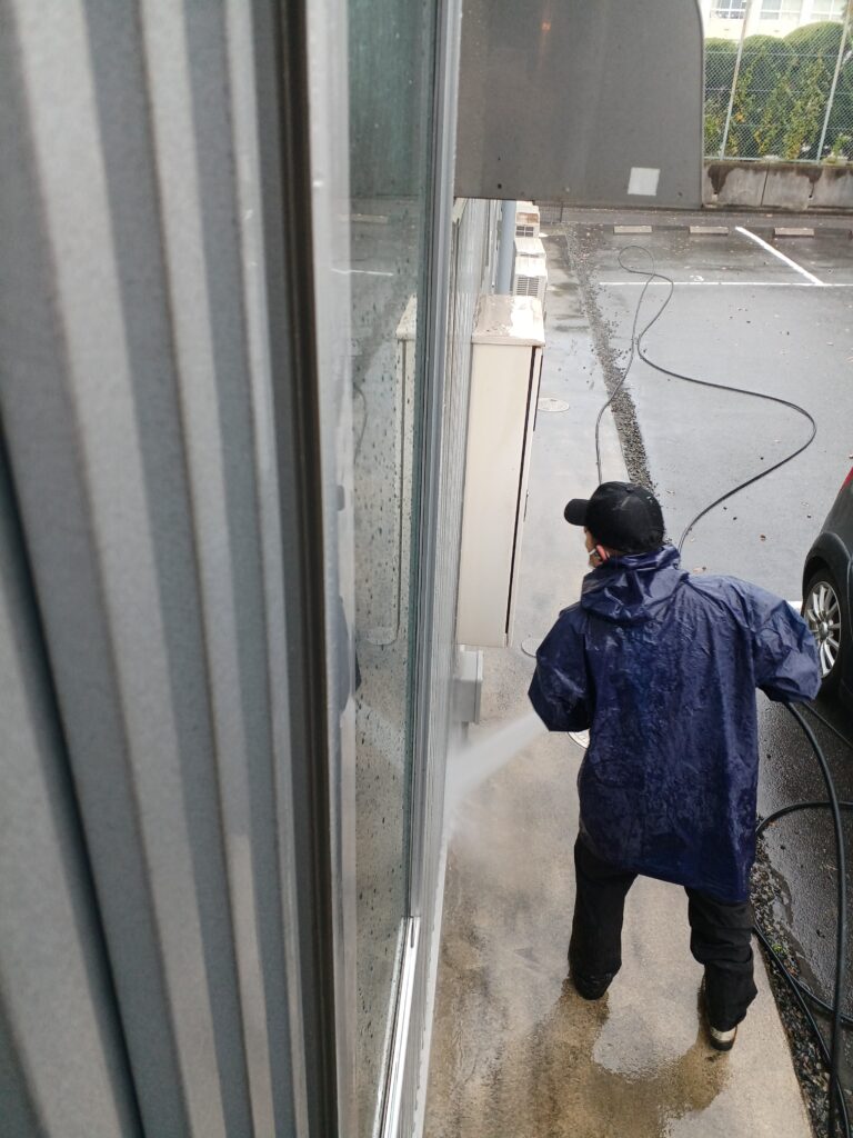 計画の後半で、一部外壁の塗り替えを行っていく予定がありますが、そのまま利用する場所は高圧洗浄機でクリーニングを。