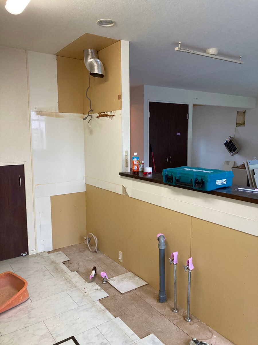 配管のみ残して解体されていたキッチン部分に、新しいキッチンが設置されました!