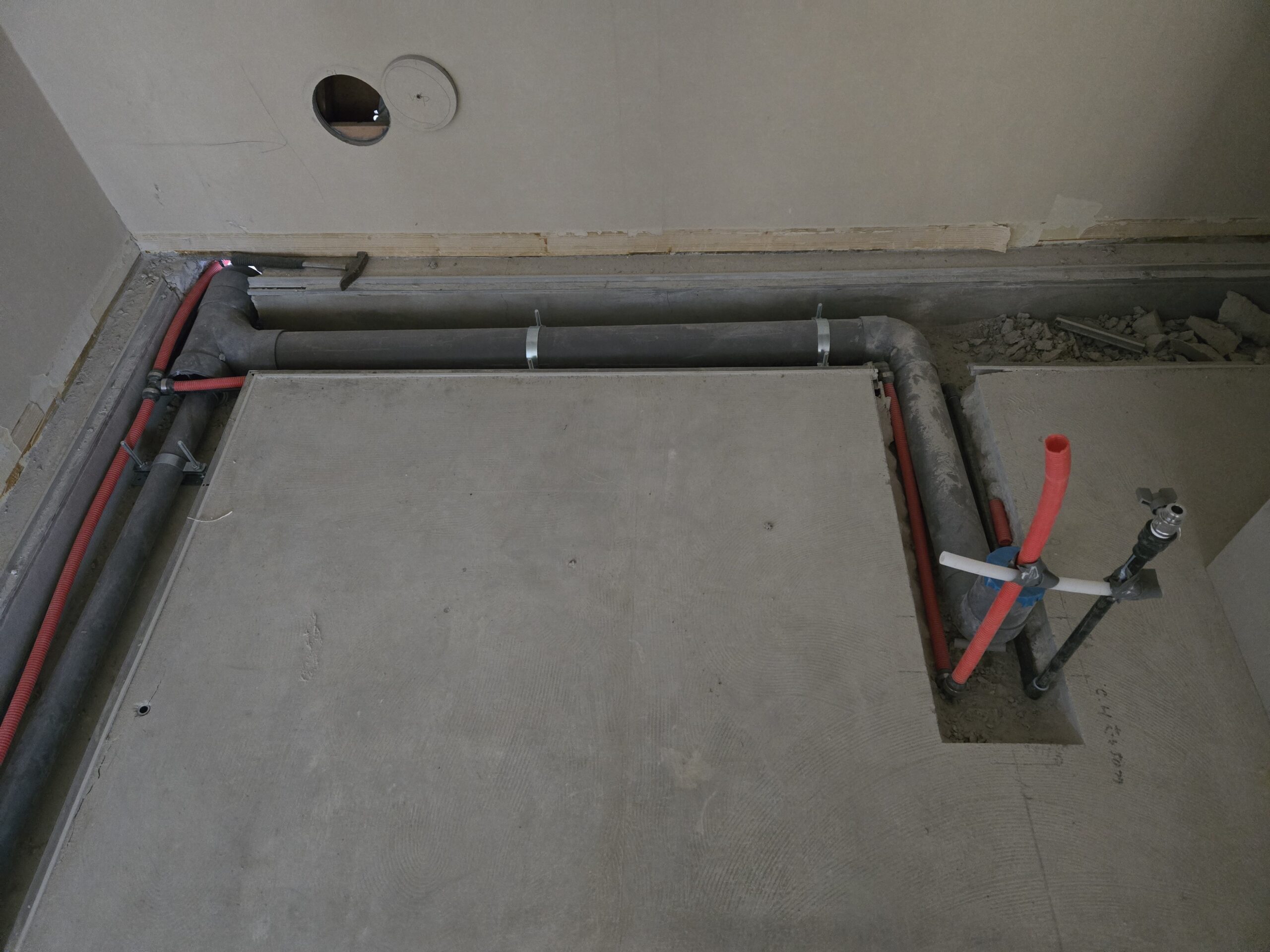 グレーの管が使用後の水を流す為の排水管、オレンジの管は水道管から水を通して水栓に繋がっていく予定です。