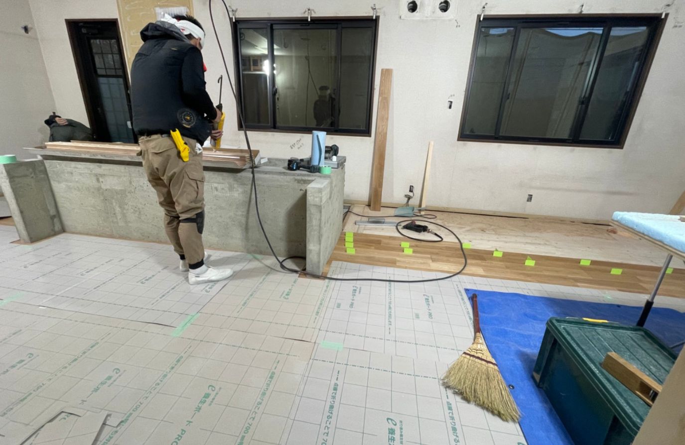 床全体をしっかりと養生し、保護が完了しました。これで他の作業が安心して進められる状態になります。完成した姿を見られる日が待ち遠しいですね!