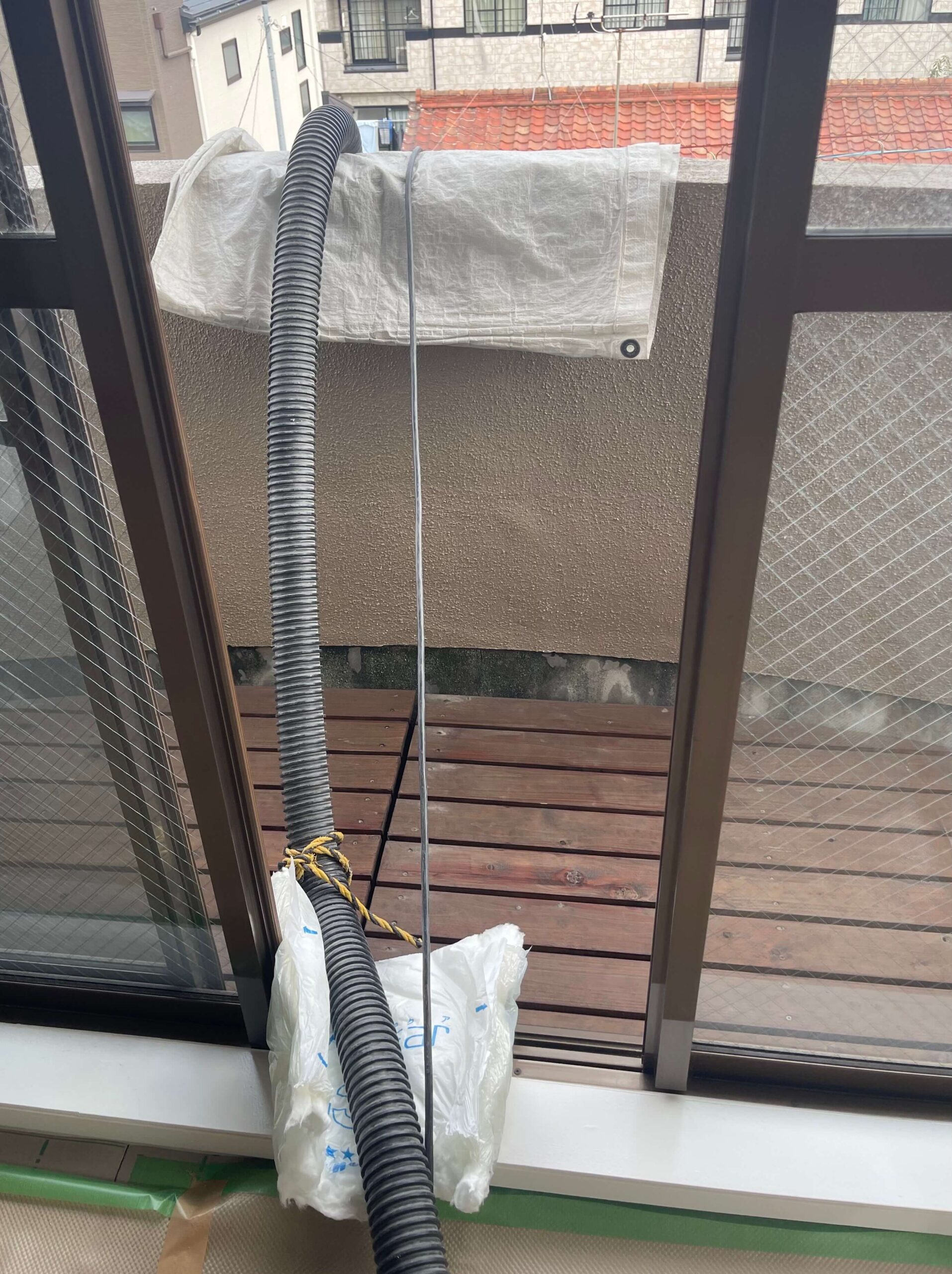 専用機械を積んだトラックから専用のホースを伸ばし、ベランダから部屋まで通し、天井裏へ吹き込んでいきます。