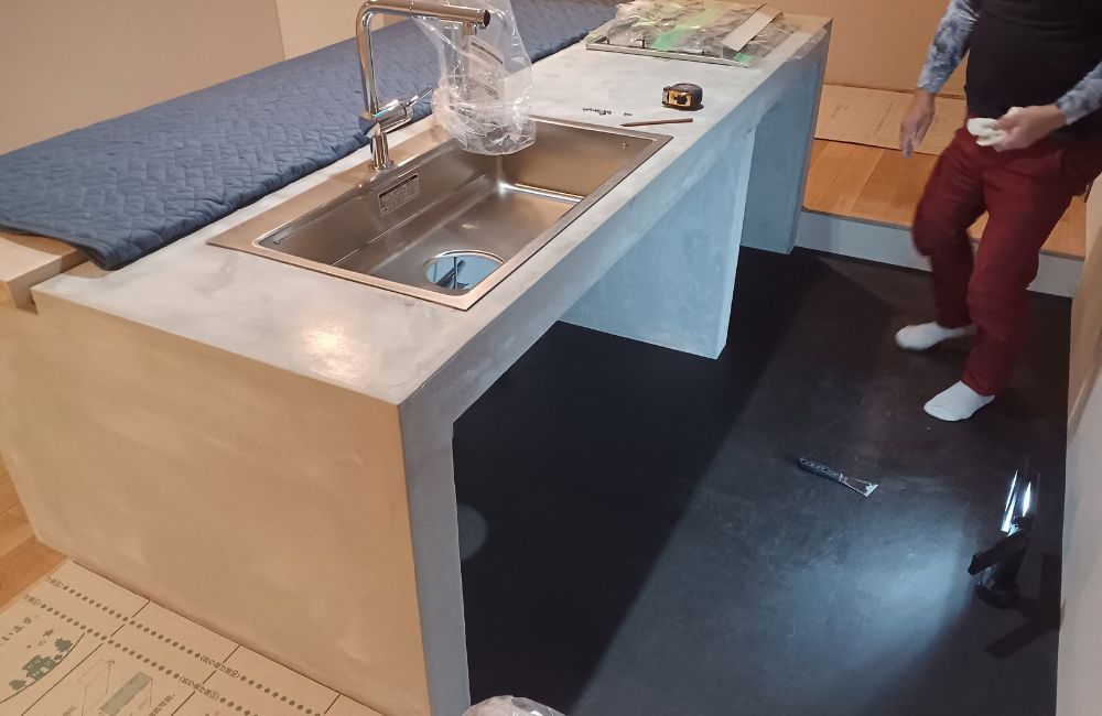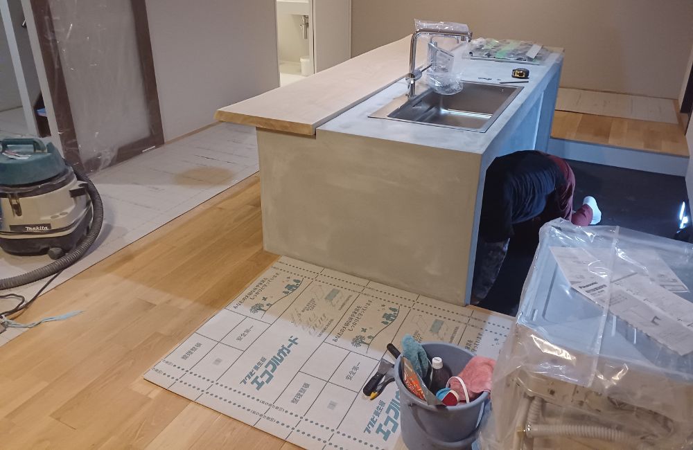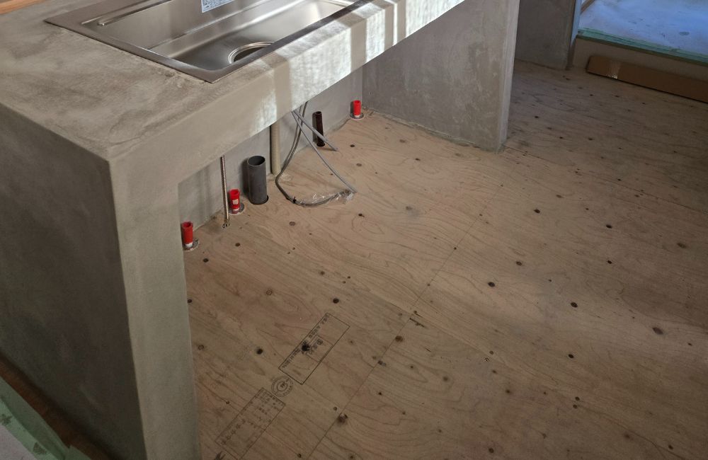 今回の工程は、キッチンのダウンフロア部分にフロアタイルを貼る作業です。
