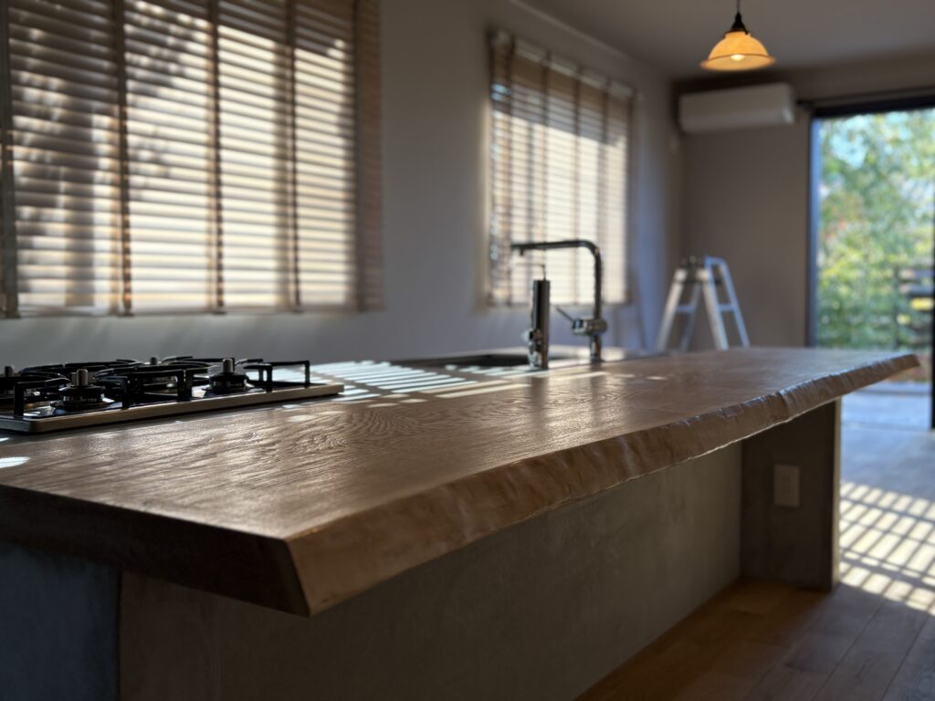 今回のリノベーションの目玉でもある、コンクリートキッチン×一枚板のカウンター。このカウンターは、空間の象徴であると同時に、Y様との思い出そのものでもあります。