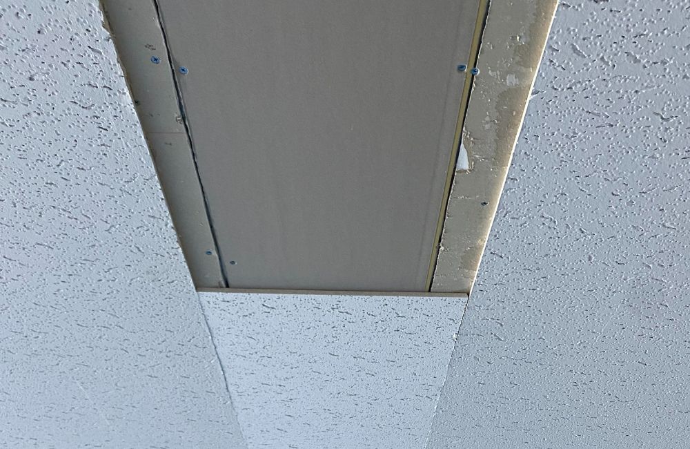 既存の天井に合わせて新しい天井ボードとなる「ジプトーン」を張り、復旧作業をする重要な工程です。ボードを一枚ずつ固定しながら、継ぎ目やビスピッチにも注意して施工していきました。
