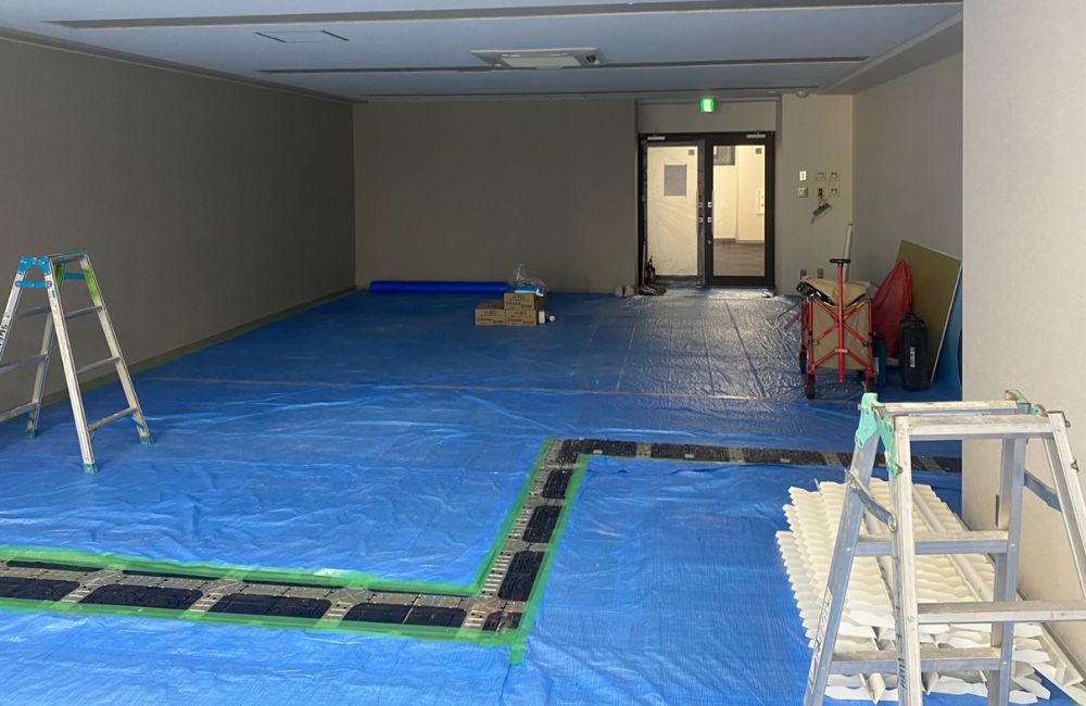 まずは、図面をもとに床に正確な墨出しを行い、そのラインに沿ってランナーを固定していきます。