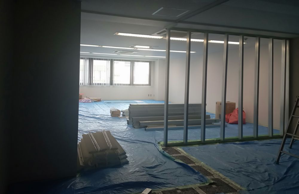 既存の照明器具を撤去し、天井を補修した後、次の工程として壁を立ち上げるための下地工事に入りました。