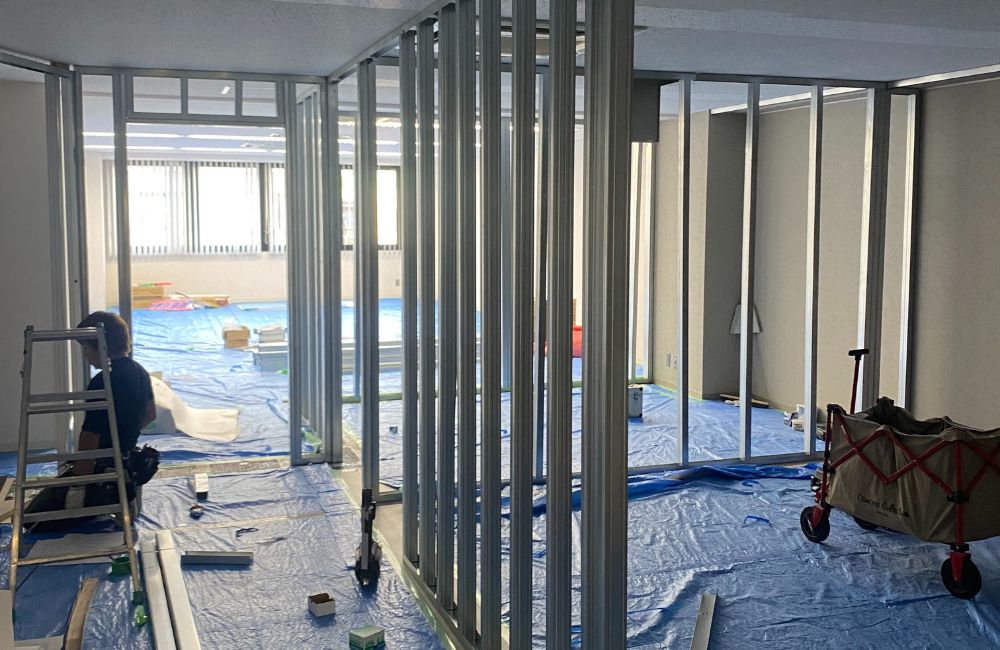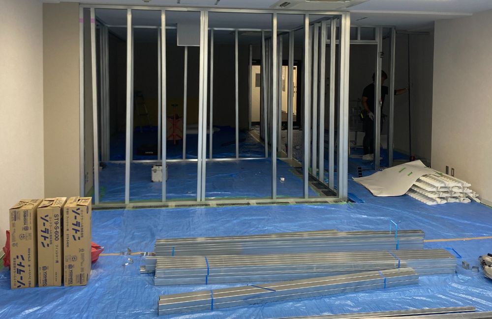 オフィスや店舗の内装工事では一般的に用いられる工法で、精度が高く、仕上がりが美しい壁をつくることができます。