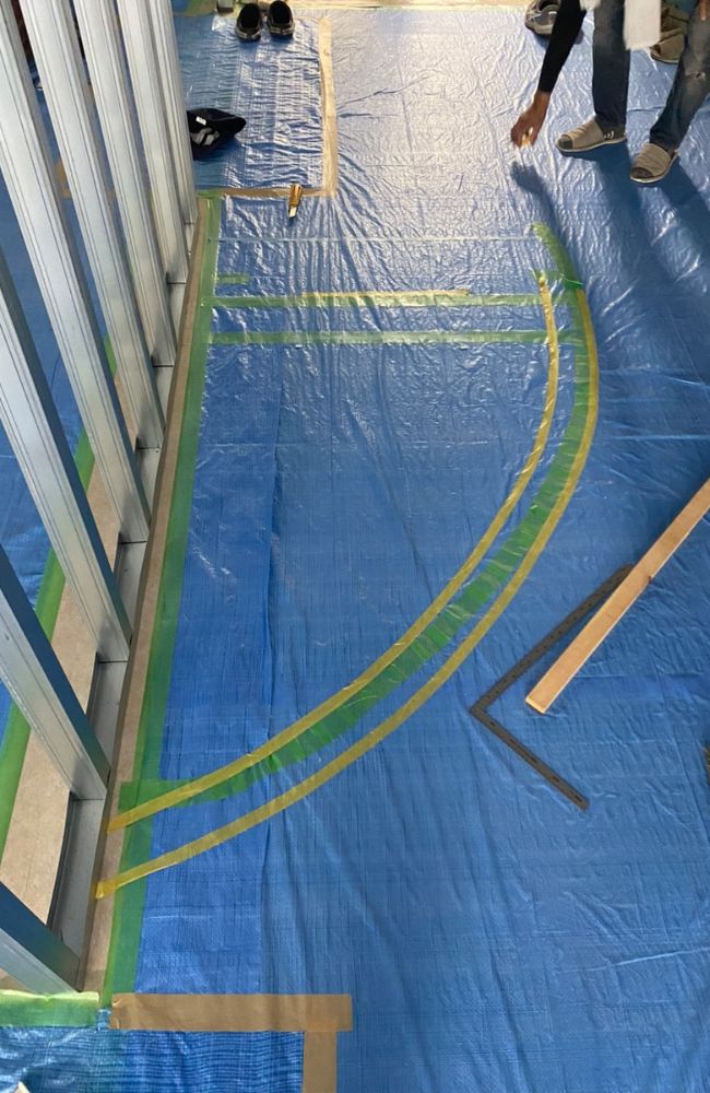 今回の現場では、空間の印象をやわらかくするR壁(曲線の壁)を施工しました。