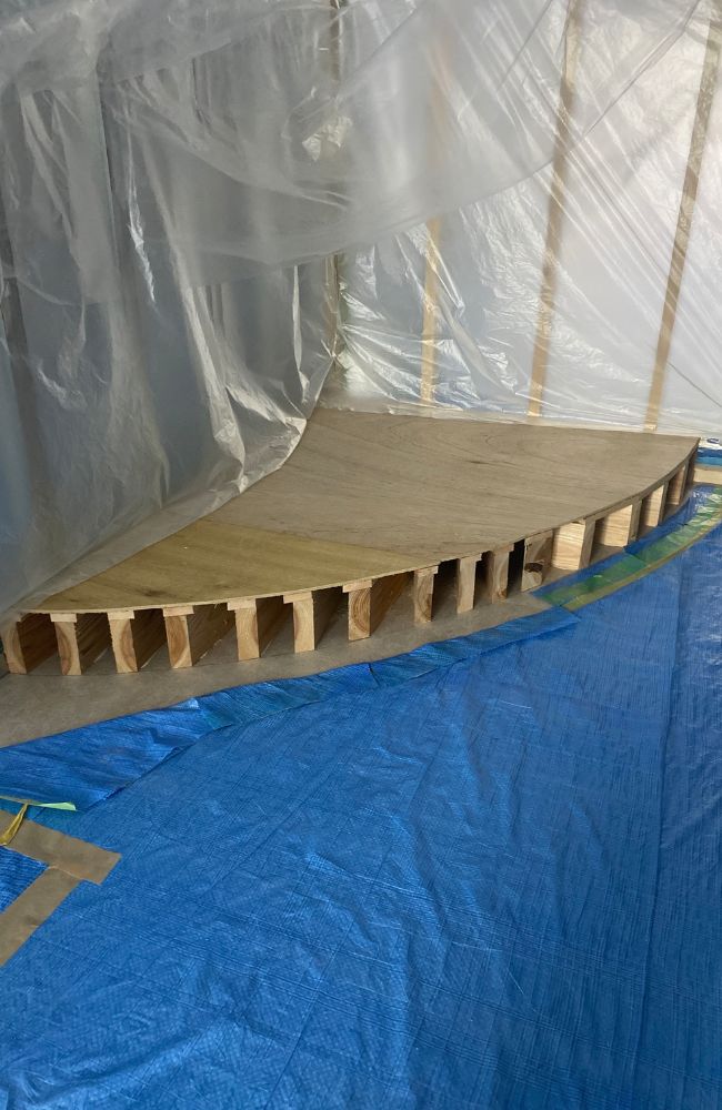 その後、曲線に合わせて加工したボードを貼り、少しずつなめらかなRの形状をつくっていきます。