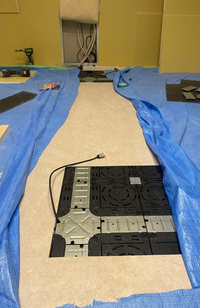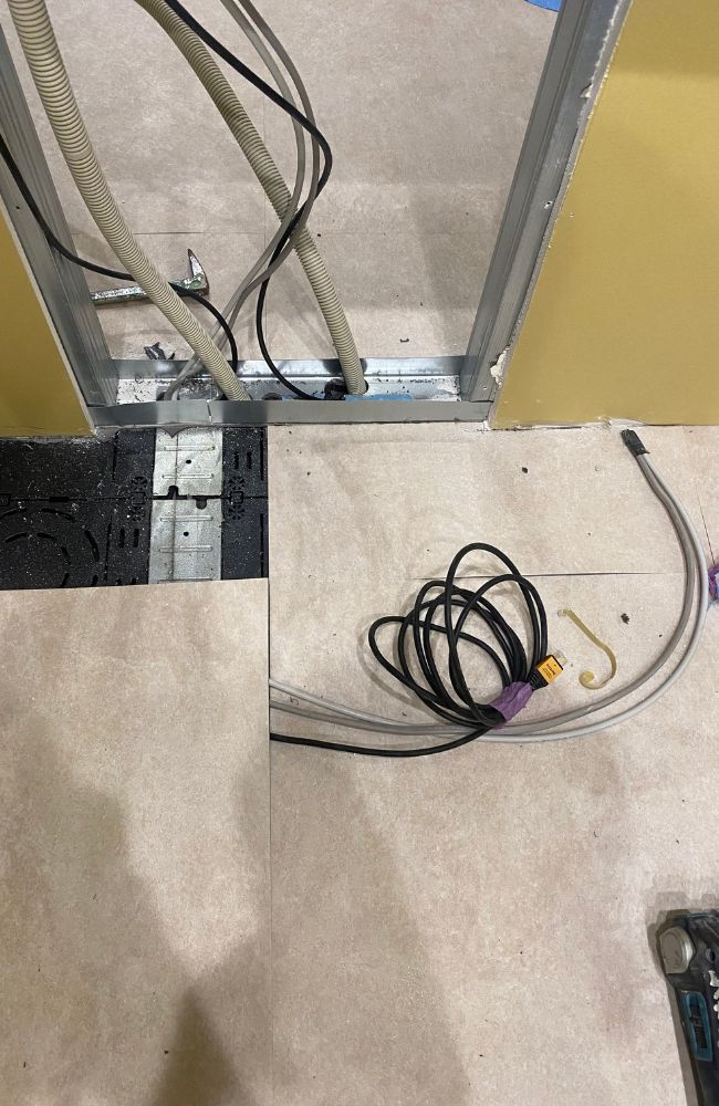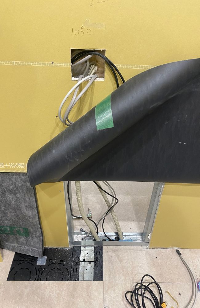 今回の計画では、事務所内でモニターを設置することを想定し、HDMIケーブルを壁の中に配線する工事を行いました。