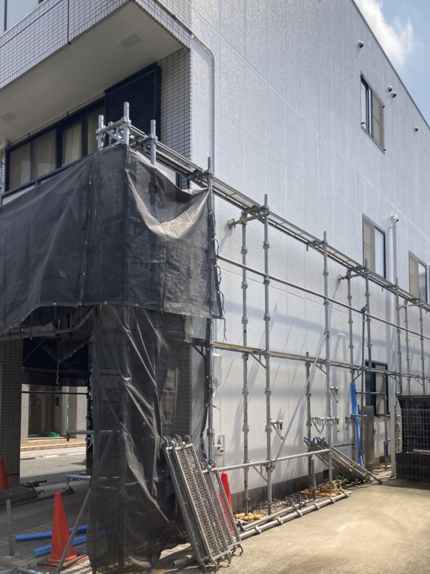 前回までに、防水工事が無事完了し、建物外周の足場について一部解体を行いました。